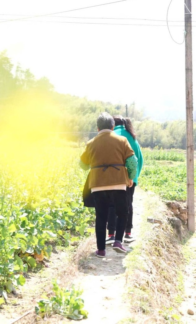 3月11日,记者去绩溪采访。路两边的油菜花开得正盛,金黄一片。琪琪拉着奶奶的手,一步一步走在小路上。汪小玲教她认田里的庄稼,找花丛里的蝴蝶。小路有些崎岖,琪琪有时候会害怕,往奶奶怀里躲。此时,汪小玲放开她的手,语气严厉却饱含深意:“看好脚下的路,一步一步自己走。”