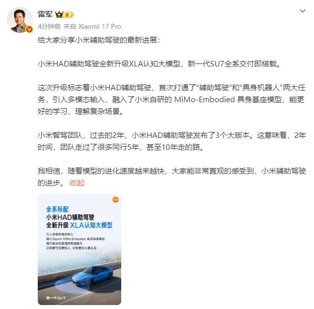 小米HAD辅助驾驶全新升级XLA认知大模型,新一代SU7全系交付即搭载。这次升级标志着小米HAD辅助驾驶,首次打通了“辅助驾驶”和“具身机器人”两大任务,引入多模态输入,融入了小米自研的 MiMo-Embodied 具身基座模型,能更好的学习、理解复杂场景。小米智驾团队,过去的2年,小米HAD辅助驾驶发布了3个大版本。这意味着,2年时间,团队走过了很多同行5年、甚至10年走的路。我相信,随着模型的进化速度越来越快,大家能非常直观的感受到,小米辅助驾驶的进步。