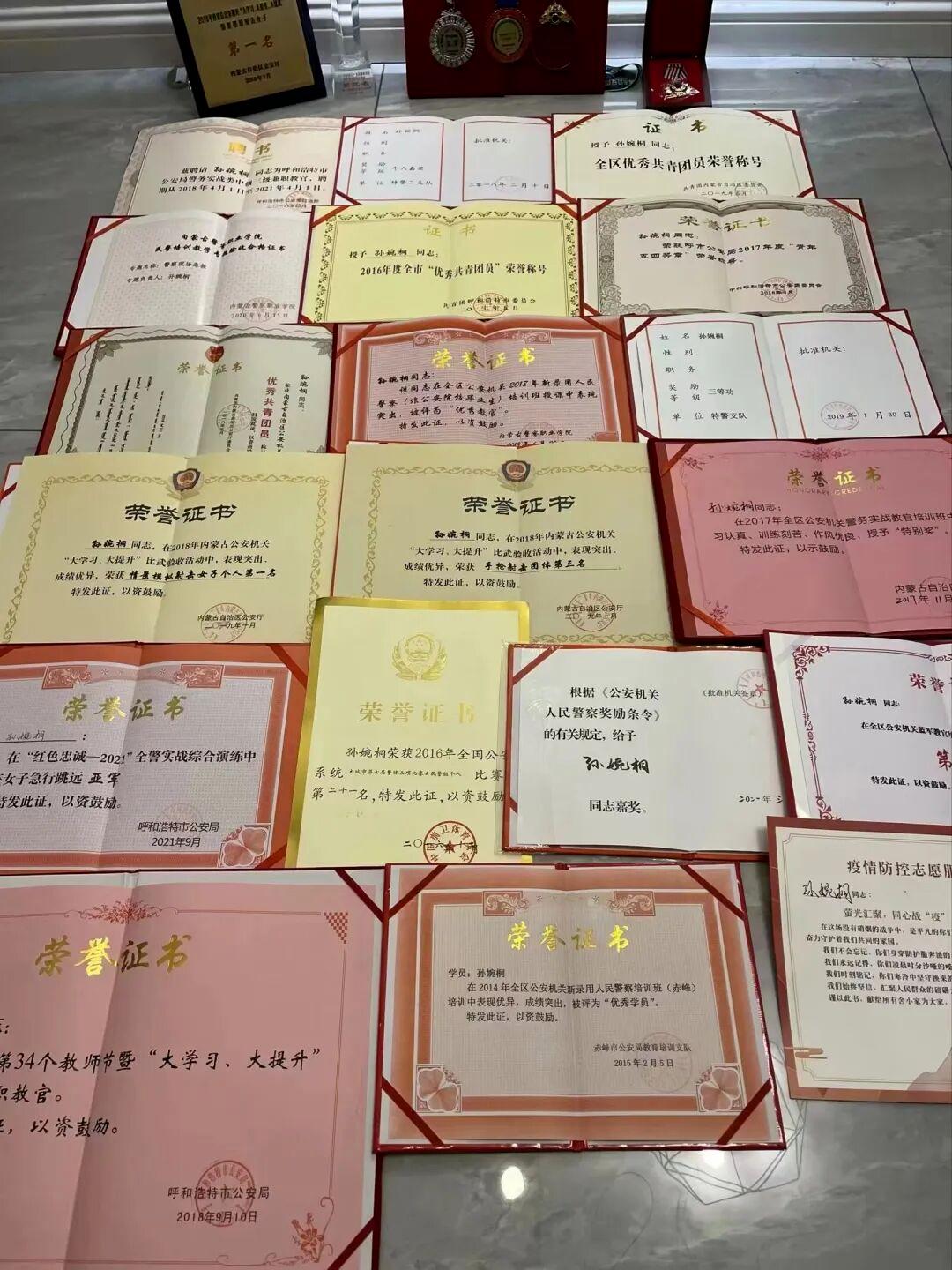 2017 年全区公安机关警务实战教官考核比武女子组第一名;2018 年全区公安机关情景模拟射击女子组第一名;2019 年东北三省与俄罗斯远东地区比武交流警察两项个人第二名……