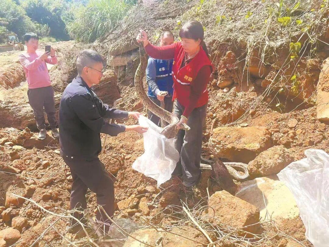 据悉,最先发现蟒蛇的是在福田乡洛溪旁修河堤的工人。当时,施工人员正操作挖掘机开挖土方,在工地旁十余米处发现这3条蟒蛇,怀疑是因挖掘机施工震动,使它们从藏身处跑出。发现巨蟒后,现场工人立刻停止施工并报警求助。随后,公安与野生动物救助部门使用专业工具,将3条蟒蛇安全捕获,并送至安溪县野生动物救助中心进行临时安置与健康检查。