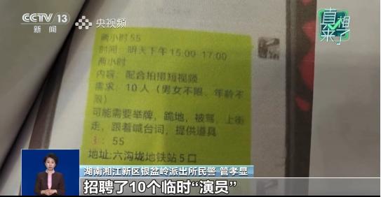 对此,湖南湘江新区银盆岭派出所民警管孝显介绍,视频在网上传播后引发舆情,被相关媒体平台及时管控。当事人为规避平台监管,更换账号继续发布。在网上以 55 元两小时的兼职报酬,招募 10 名临时 “演员”,并提前告知需配合跪地、被辱骂等动作要求。这些“演员”通过演练,摆拍了这么一段视频。