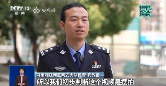 接警后,湖南湘江新区警方对该视频进行了核查,湖南湘江新区网安大队民警宾教福介绍,视频存在两处明显疑点:“一是拍摄人员佩戴口罩刻意伪装,与正常拍摄行为不符;二是从网上发现,这个视频有三个版本,分别从不同的角度进行拍摄,并且都是出自同一个账号,这个与正常拍摄也是不一样的,所以我们初步判断这个视频是摆拍。”