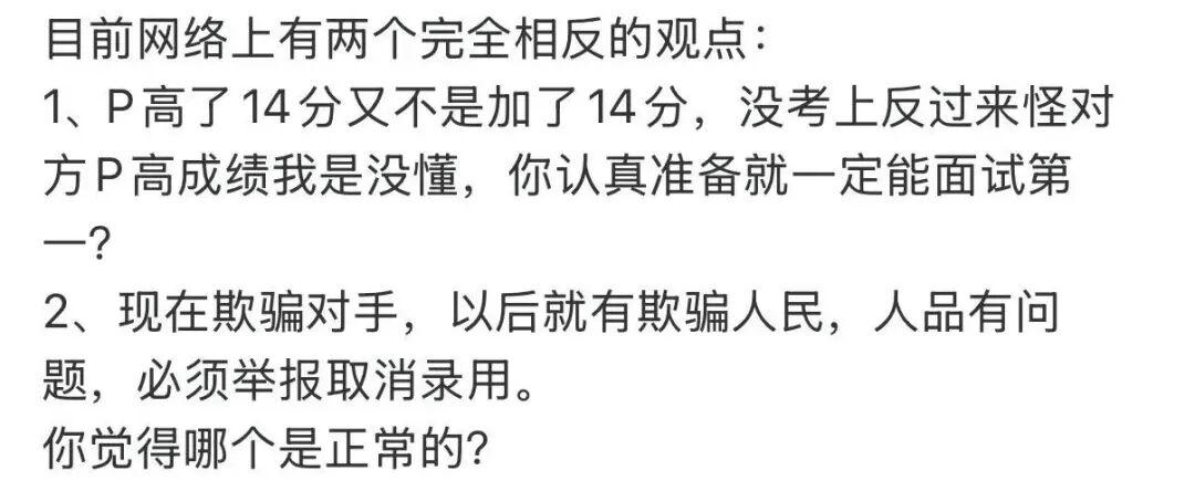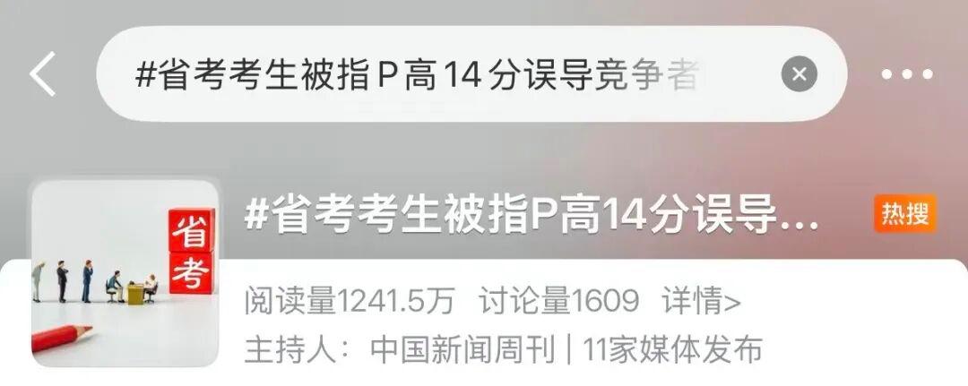 有媒体发文提醒,该事件暴露的不只是某个考生的品行问题,还暴露了公考查分规则的漏洞。现在公考,考生只能查到自己的分数和排名,看不到同岗位对手的真实分数。这就给了别有用心的人可乘之机。
