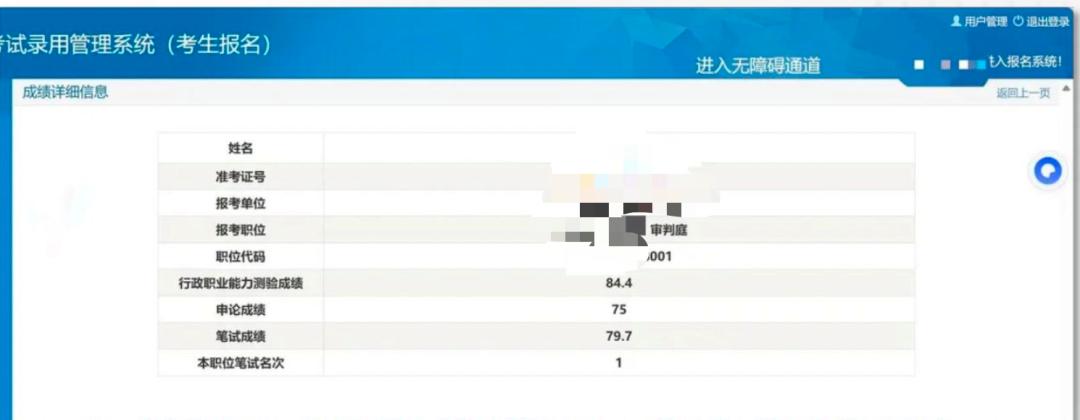 中国新闻周刊报道,去年12月,2026届硕士生李明(化名)报考了广东省公务员考试中的一个法官助理岗位,该岗位仅招录一人。笔试成绩公布后,一名自称该岗位笔试第一的网友发出了自己的“成绩单”,79.7分。李明的笔试成绩是65.25分,他瞬间陷入绝望。