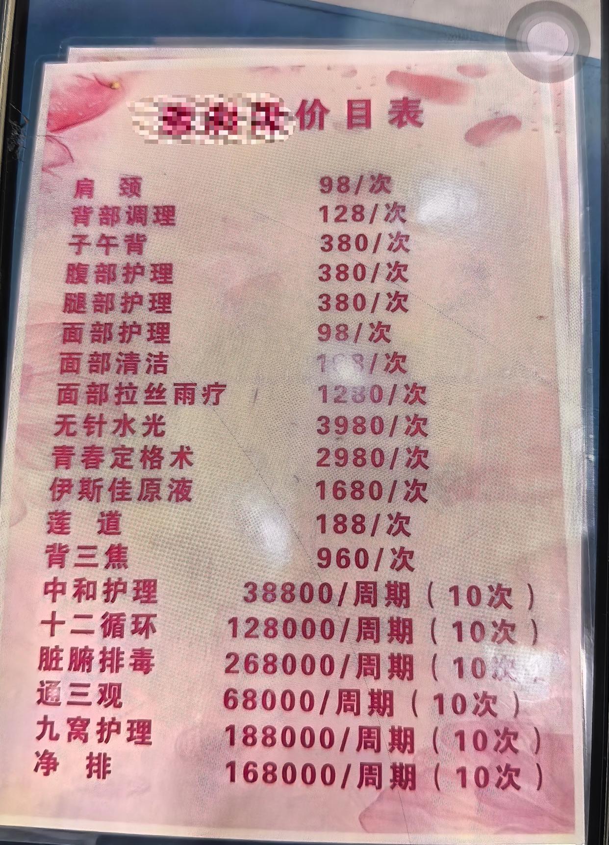 图为涉事健康养生馆门店价目表。(受访者供图)