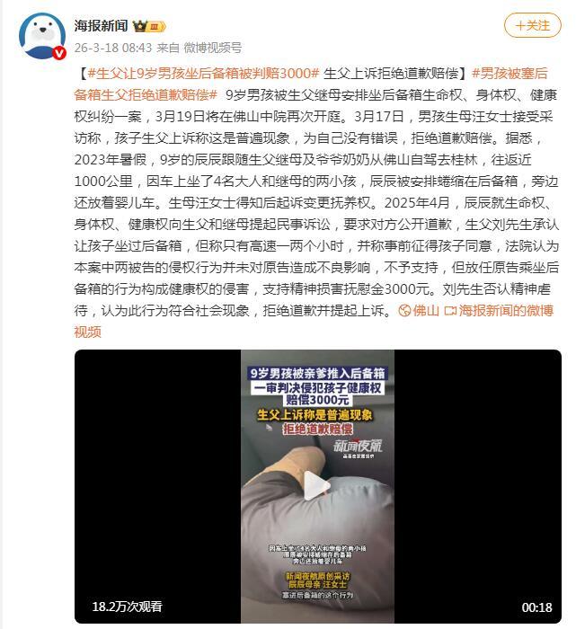 9岁男孩被生父继母安排坐后备箱生命权、身体权、健康权纠纷一案,3月19日将在佛山中院再次开庭。3月17日,男孩生母汪女士接受采访称,孩子生父上诉称这是普遍现象,为自己没有错误,拒绝道歉赔偿。据悉,2023年暑假,9岁的辰辰跟随生父继母及爷爷奶奶从佛山自驾去桂林,往返近1000公里,因车上坐了4名大人和继母的两小孩,辰辰被安排蜷缩在后备箱,旁边还放着婴儿车。生母汪女士得知后起诉变更抚养权。2025年4月,辰辰就生命权、身体权、健康权向生父和继母提起民事诉讼,要求对方公开道歉,生父刘先生承认让孩子坐过后备箱,但称只有高速一两个小时,并称事前征得孩子同意,法院认为本案中两被告的侵权行为并未对原告造成不良影响,不予支持,但放任原告乘坐后备箱的行为构成健康权的侵害,支持精神损害抚慰金3000元。刘先生否认精神虐待,认为此行为符合社会现象,拒绝道歉并提起上诉