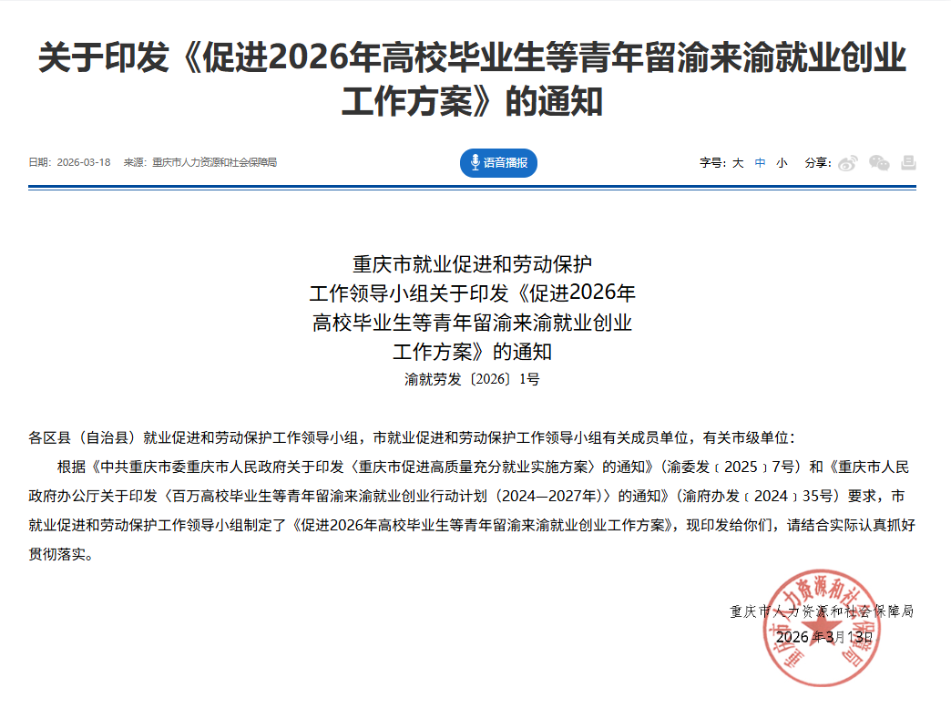 近日,重庆市就业促进和劳动保护工作领导小组印发《促进2026年高校毕业生等青年留渝来渝就业创业工作方案》(以下简称:《方案》),明确2026年将促进高校毕业生等青年留渝来渝就业创业40万人以上(市外来渝6万人以上)。2026届高校毕业生离校前落实率不低于75%,离校未就业毕业生年底就业率不低于90%,全年高校毕业生就业率不低于95%。