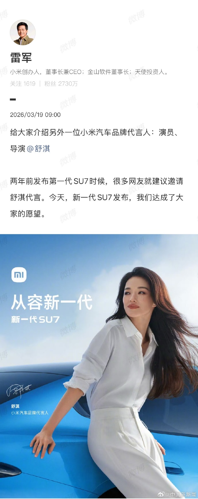 今天,雷军发文给大家介绍另外一位小米汽车品牌代言人:演员、导演舒淇。