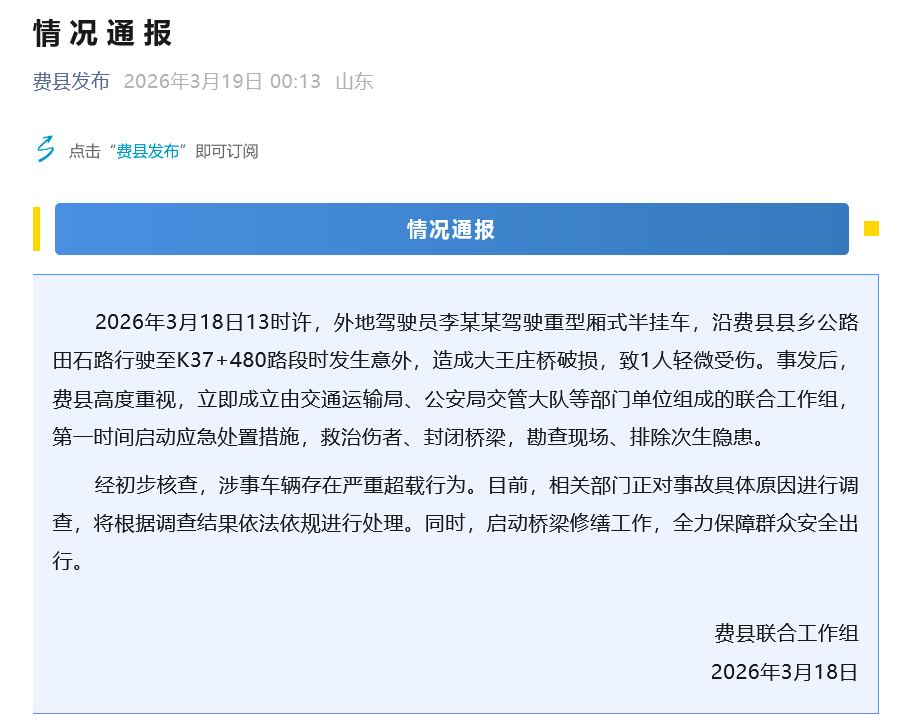 2026年3月18日13时许,外地驾驶员李某某驾驶重型厢式半挂车,沿费县县乡公路田石路行驶至K37+480路段时发生意外,造成大王庄桥破损,致1人轻微受伤。事发后,费县高度重视,立即成立由交通运输局、公安局交管大队等部门单位组成的联合工作组,第一时间启动应急处置措施,救治伤者、封闭桥梁,勘查现场、排除次生隐患。