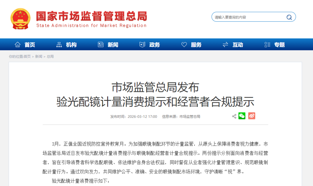 3月12日,国家市场监督管理总局提醒消费者,配镜应选择正规门店,并核查验光设备及验光人员资质。