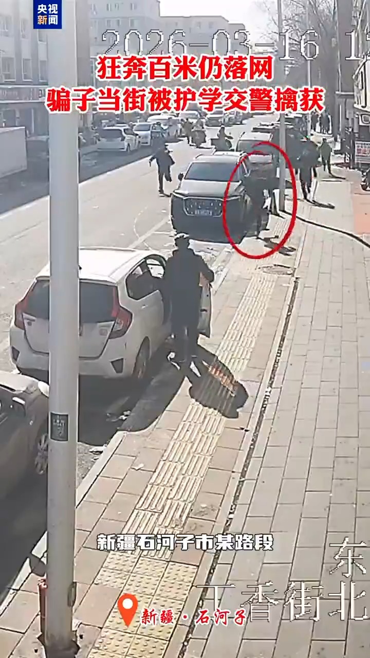 近日,新疆石河子市某路段,正值学生放学高峰。一名男子神色慌张,执勤交警迅速冲上前去,一把将其摁倒在地。这名男子正是警方盯梢十余天的电诈人员。