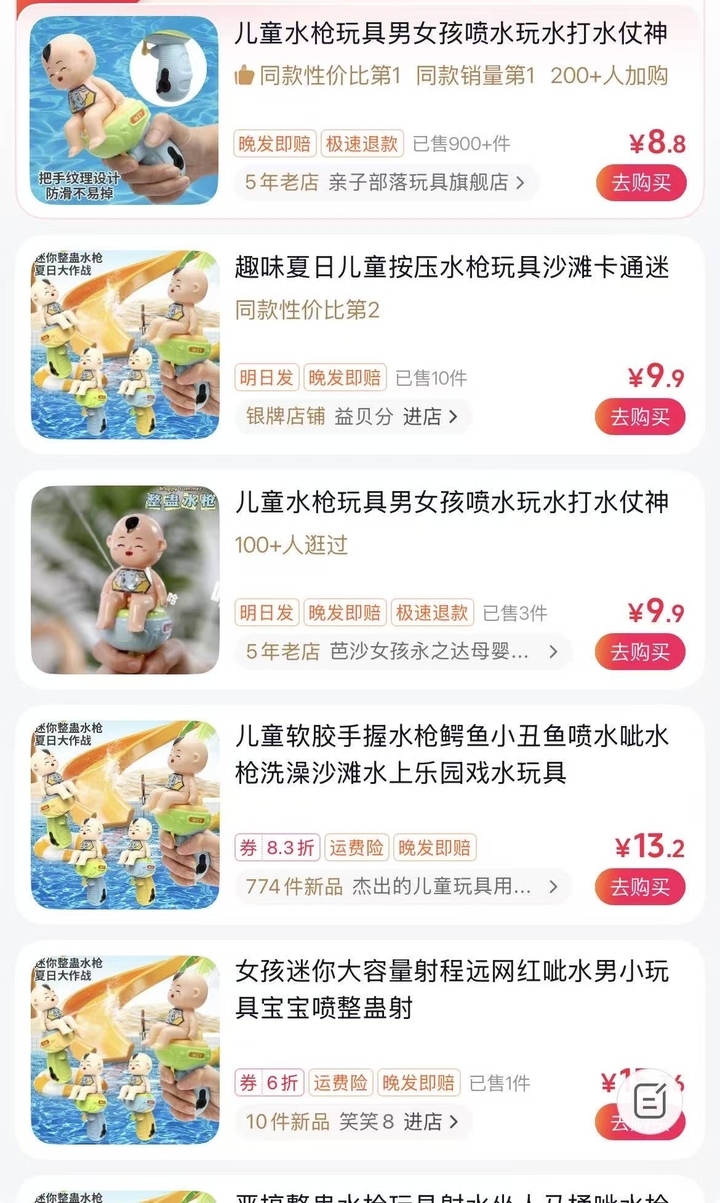 此外,这类商品在多个电商平台的分类中,被归入“创意礼物”或“整蛊玩具”,但仍有不少商家为了吸引消费者,在标题中刻意使用“儿童趣味水枪”“六一礼物”等关键词。