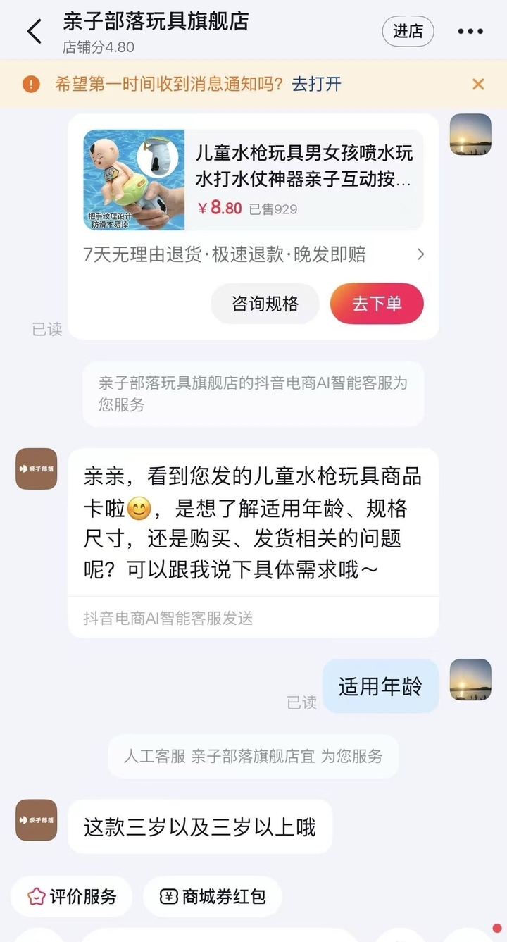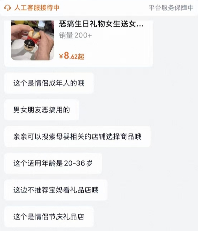 记者就产品设计寓意和受众问题向商家咨询,部分商家选择“避而不谈”,只是机械地向记者推送商品链接,试图转移话题。另有商家明确表示,该类产品适用年龄是20-36岁,仅供成年情侣用于恶搞整蛊,并非面向儿童群体。然而,记者在查阅该类商品详情页时发现,此类产品在标题和宣传海报上仍然使用“宝宝快乐装备”等措辞,并清晰标注“适龄:36m+”,与商家口中“成人专属”的定位互相矛盾。还有商家则明确表示,此类玩具水枪的适用年龄为“3岁及3岁以上”。