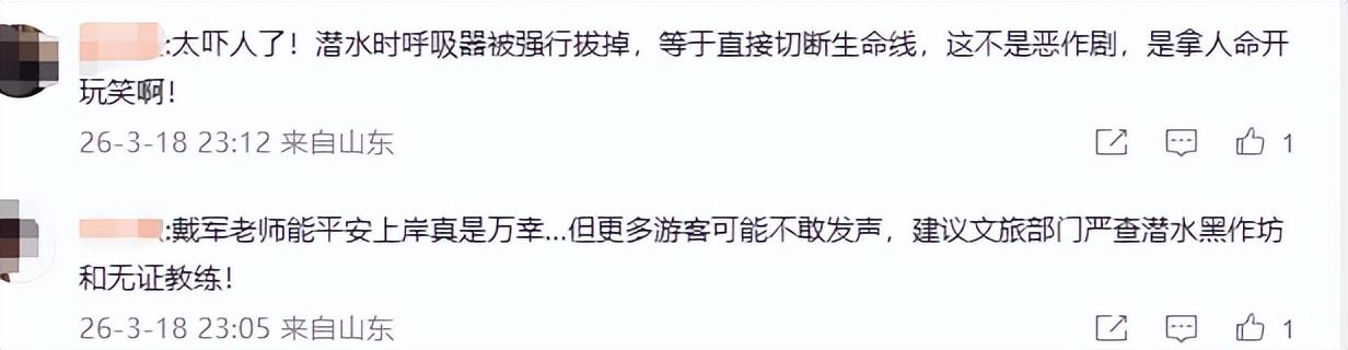 对此,不少网友表示潜水项目类似乱象频发,有网友说:“水下缺乏取证条件,事后维权成功率极低,游客需以事前防范为首要原则,也有网友说:“太吓人了!潜水时呼吸器被强行拔掉,等于直接切断生命线,这不是恶作剧,是拿人命开玩笑啊!”