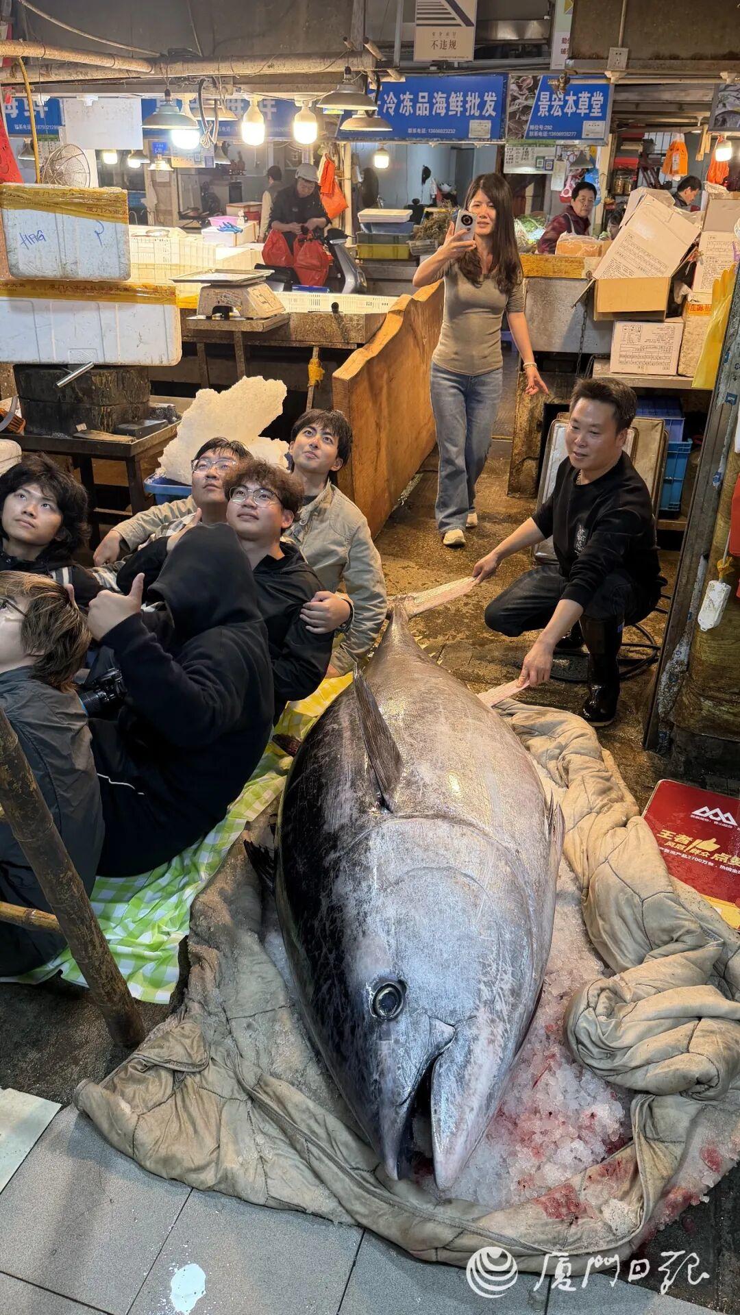 陈文勇是龙海人,在厦门谋生多年。第八市场这家“大鼓深海鱼”是他父亲一手创立的鱼铺。为了处理这条“大块头”,店里特意请来了一位有着十几年经验的杀鱼师傅操刀,一个多小时就将鱼分割完成。见现场气氛热烈,陈文勇还切下一些靠近鱼骨的肉分给大家品尝,自己先尝了一口,笑着竖起大拇指:“好料!”