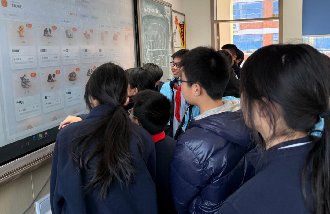 得到肯定的眼神后,她兴奋地在教室大屏页面中找到自己领养的“电子宠物”,为它加了一点经验值,剩下的几位同学在周围跃跃欲试,就等着订正完作业去喂养。