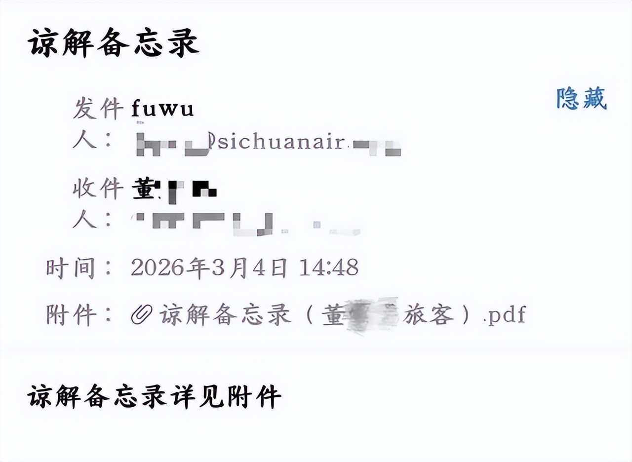 然而,当董女士打开邮件时,收到的却是一份名为《谅解备忘录》的协议文件。记者在这份备忘录中看到,川航将这笔1000元称为“关怀金”,而非赔偿金。协议中多项条款引发了董女士的不满: