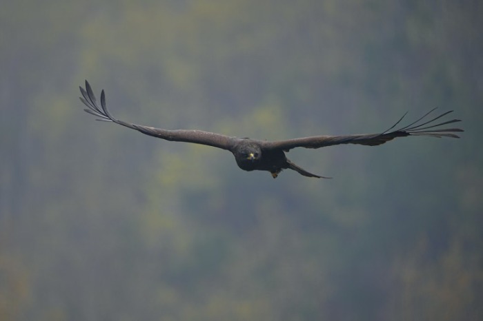 20日下午,何斌告诉大皖新闻记者,当天四顶山山顶天气状况不佳,能见度较低。一只通体黑褐色的猛禽突然从山脊迎面飞来,翼展目测接近两米。何斌回忆道,该猛禽不仅在空中盘旋,还做出了向下俯冲捕食动作,随后消失在山脊另一侧。经鸟类专家虞磊确认,这一“黑影”正是林雕。