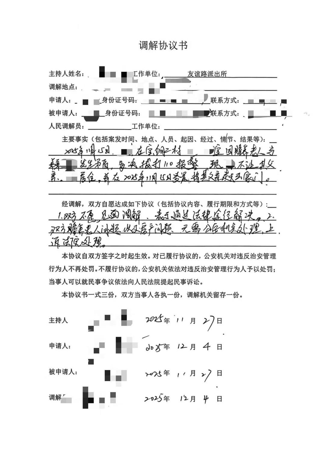 2025年12月初的一份调解协议书