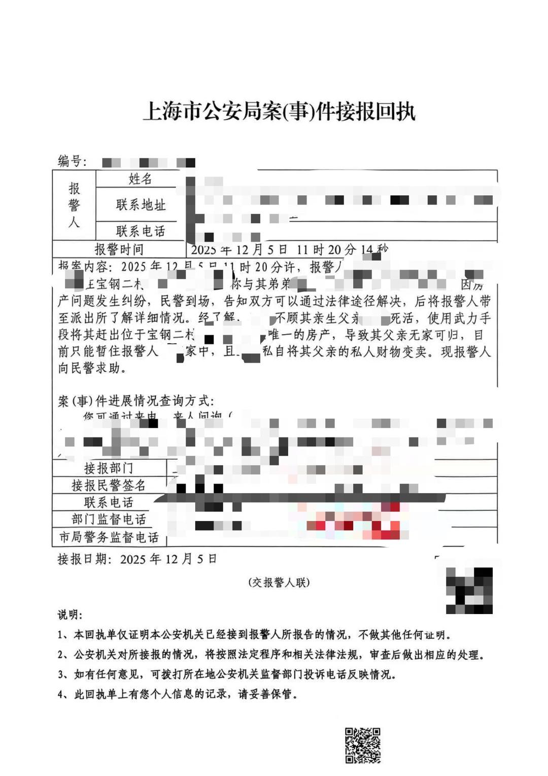 报案回执显示,2025年12月5日,女儿曾报案,称因房产问题发生纠纷。民警到场,告知双方可以通过法律途径解决,后将报警人带至派出所了解详细情况。