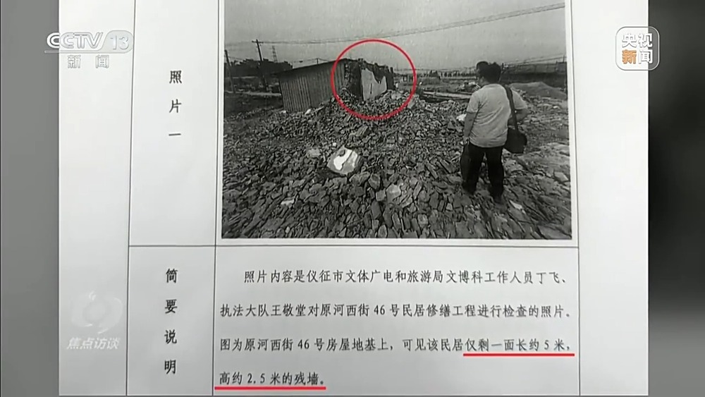河西街46号民居的修缮问题被原居民丁先生举报,等文物部门下达停工通知派人员到现场时,民居仅剩一面长约5米,高约2.5米的残墙。这份针对现场的评估意见中写道:修缮工程已改变修缮方案中的修缮方式,未及时履行变更手续,前期施工极不规范,对不可移动文物造成一定损害,局部造成严重后果。