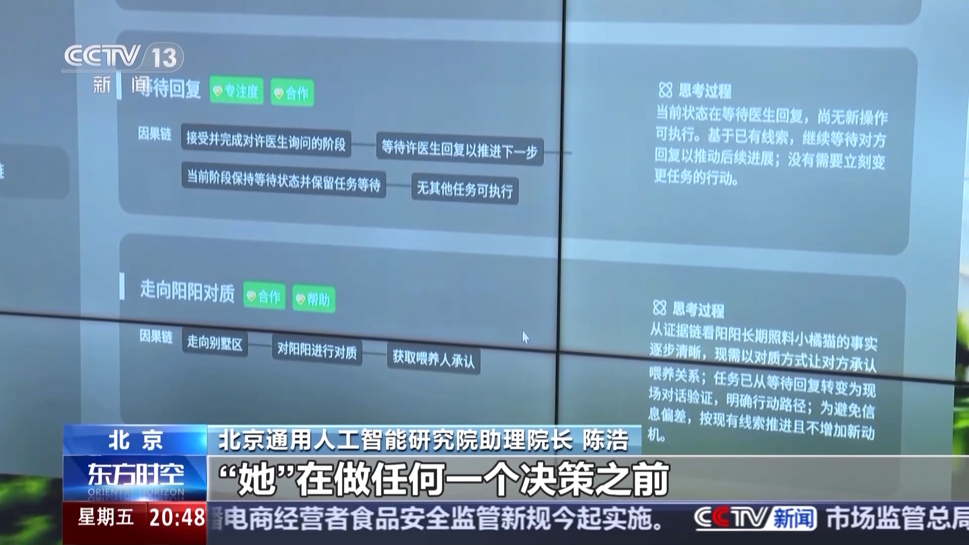 北京通用人工智能研究院助理院长 陈浩:“通通”在和他人对质的过程中,“她”背后有多个维度的价值在作用,一个维度的价值是“她”要完成自己的任务帮助别人,另外一个价值是“她”还要维护和“她”对质的这个人之间的关系。“她”在做任何一个决策之前,在脑海里会预演各种各样的可能性,在每一种可能性里边基于价值进行评判。