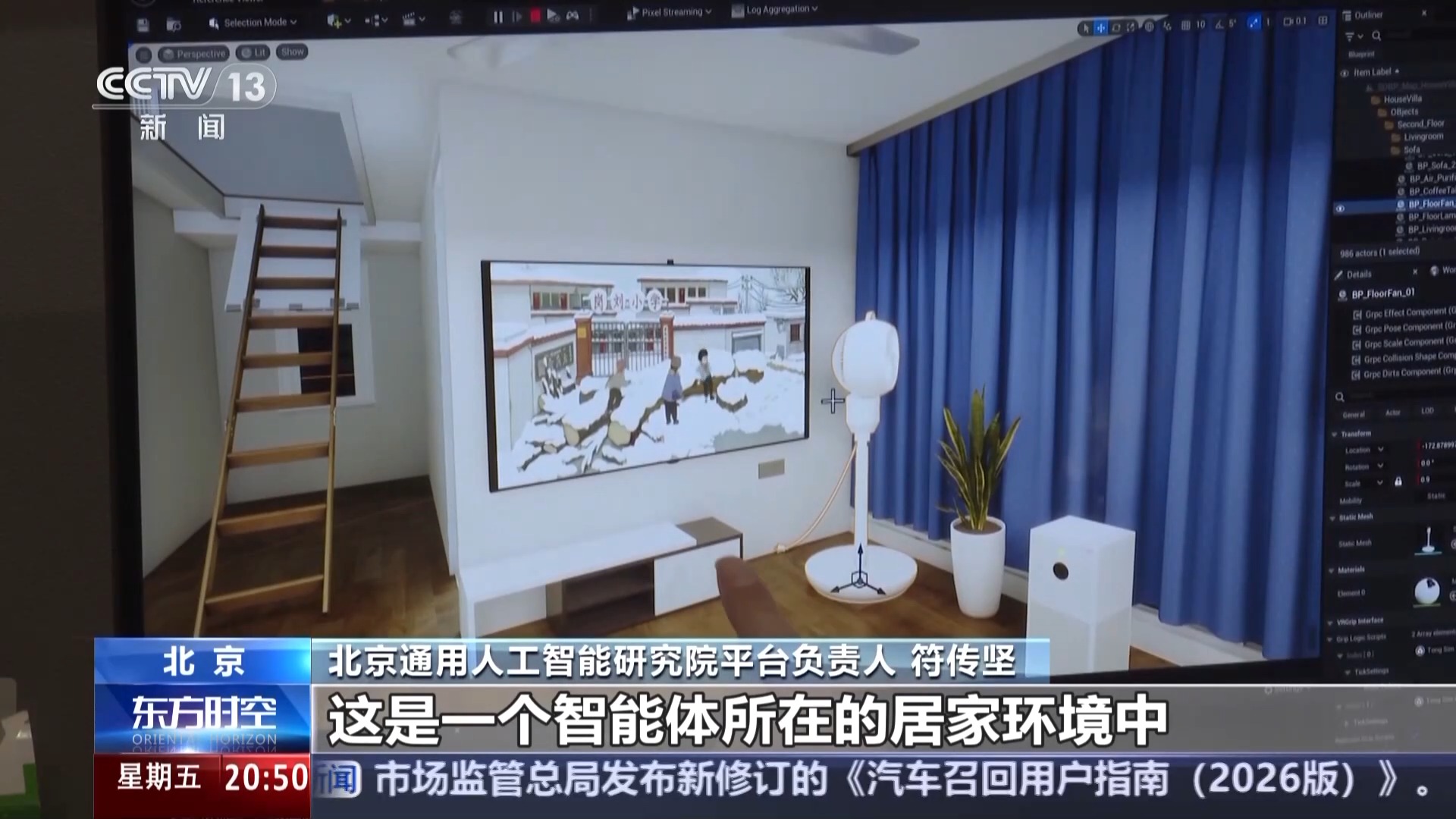 北京通用人工智能研究院平台负责人 符传坚:这是一个智能体所在的居家环境,里边我们为“她”(“通通”)设计了丰富的电器家具,比如说加湿器,能显示湿度。风扇能够出一些虚拟的风,降低环境的温度,还有它的扇叶能摆动。