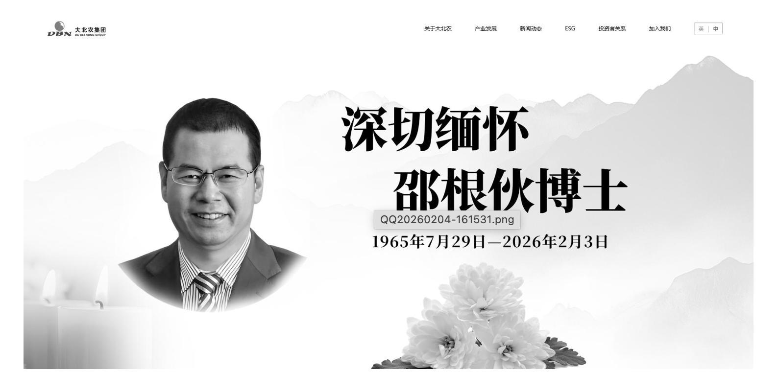 该公司此前对外发布的讣告显示,邵根伙博士,1965年7月生,浙江金华人。1982年考入浙江大学(原浙江农业大学),1986年师从中国农业大学杨胜教授深造,1991年获农学博士学位,并入职北京农学院工作。1993年创建大北农集团。于2026年2月3日15时因病在北京逝世,享年60岁。