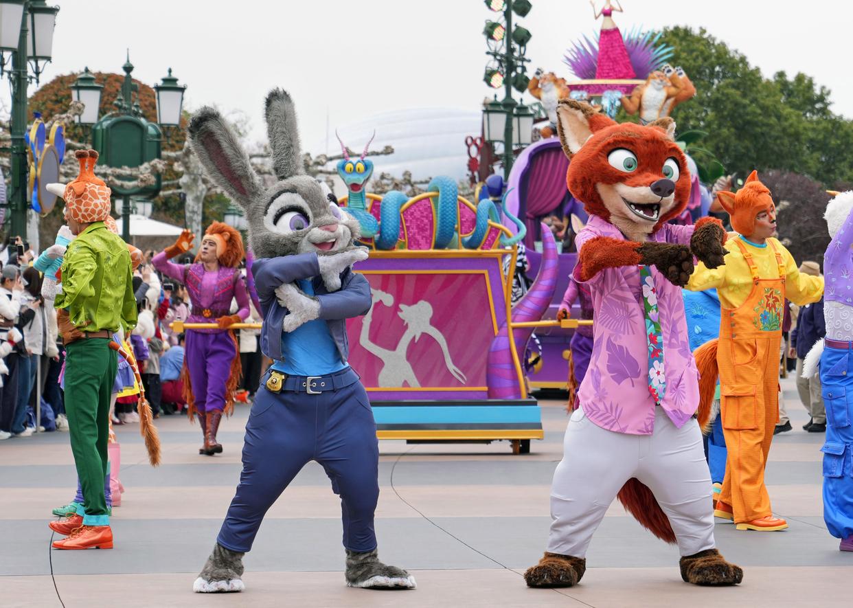 3月20日,在上海迪士尼乐园,演职人员扮演的朱迪和尼克在巡游中跳舞。新华社记者 刘颖 摄