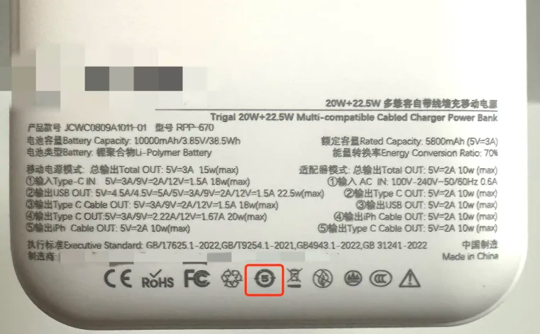 △画圈处为充电宝上的电池可循环使用5年年限标识。