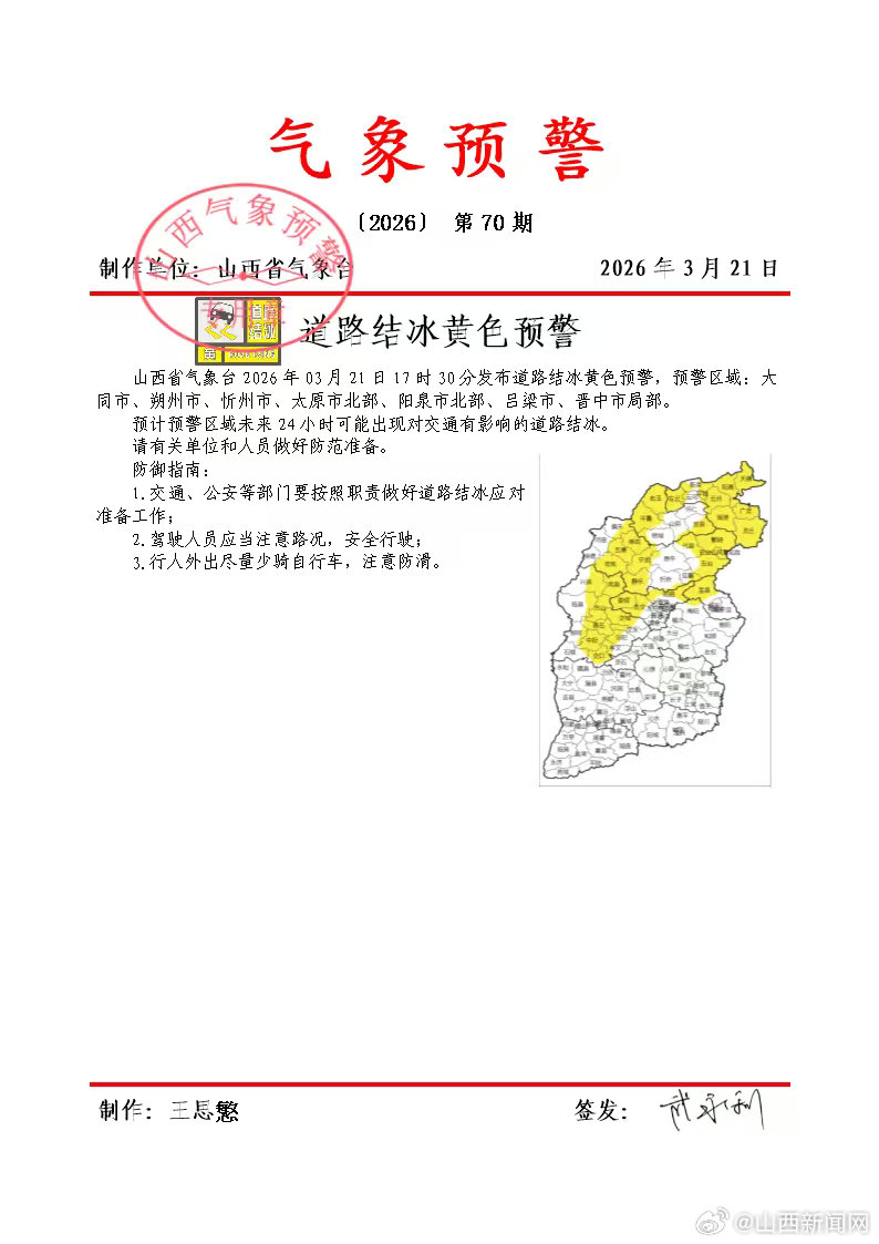 #山西气象预警# 【山西发布道路结冰黄色预警】山西省气象台2026年03月21日17时30分发布道路结冰黄色预警,预警区域:大同市、朔州市、忻州市、太原市北部、阳泉市北部、吕梁市、晋中市局部。预计预警区域未来24小时可能出现对交通有影响的道路结冰。请有关单位和人员做好防范准备。防御指南:1.交通、公安等部门要按照职责做好道路结冰应对准备工作;2.驾驶人员应当注意路况,安全行驶;3.行人外出尽量少骑自行车,注意防滑。