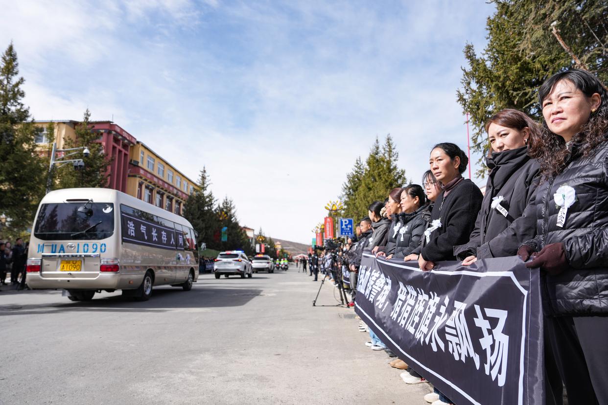 海拔约3500米的红原,几度飞雪。送别他时,战友、学生、干部、群众……人们挤满了红原县城的广场,一行行热泪打湿了脸颊。来自金川的藏族阿妈王正芳与阿旺素不相识,但一大早就守在街头。“他是为保护我们平安牺牲的。我一定要来送他!”