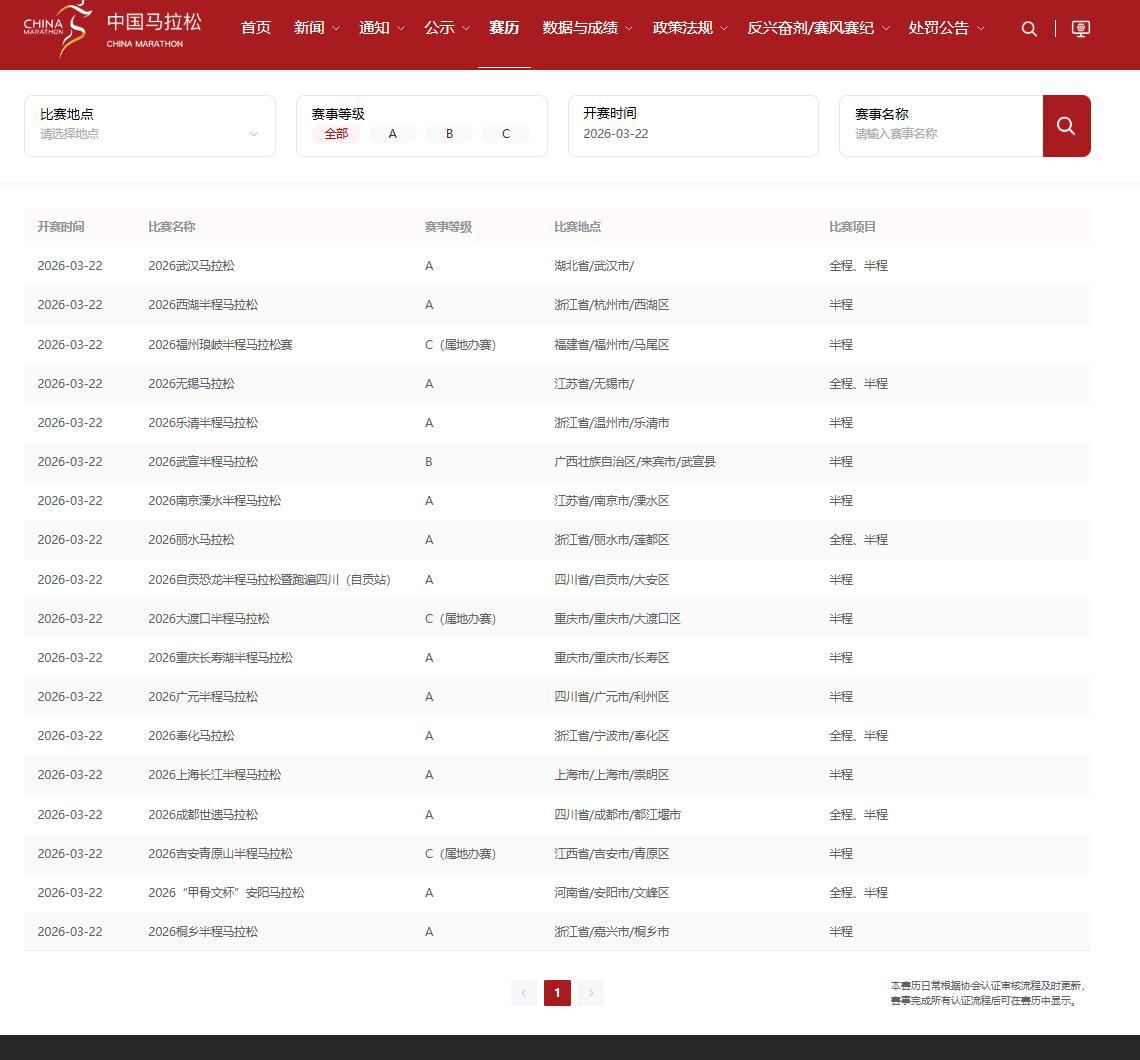 广西来宾武宣举办了B类赛事,2026武宣半程马拉松比赛。举办C类赛事的有福州马尾区、重庆大渡口区、吉安青原区等。武汉、无锡、丽水、奉化、成都都江堰、河南安阳等6个城市马拉松赛事包含全程、半程项目,其余12个马拉松比赛均为半程项目。