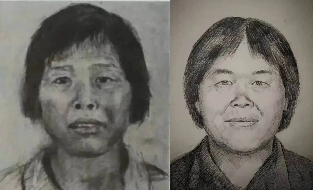 ▲2017年,广州增城警方公布“梅姨”画像(左)。2019年,山东模拟画像专家林宇辉再次为“梅姨”画像(右)。