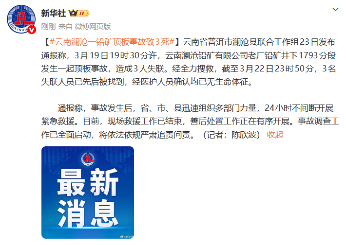 云南省普洱市澜沧县联合工作组23日发布通报称,3月19日19时30分许,云南澜沧铅矿有限公司老厂铅矿井下1793分段发生一起顶板事故,造成3人失联。经全力搜救,截至3月22日23时50分,3名失联人员已先后被找到,经医护人员确认均已无生命体征。通报称,事故发生后,省、市、县迅速组织多部门力量,24小时不间断开展紧急救援。目前,现场救援工作已结束,善后处置工作正在有序开展。事故调查工作已全面启动,将依法依规严肃追责问责。