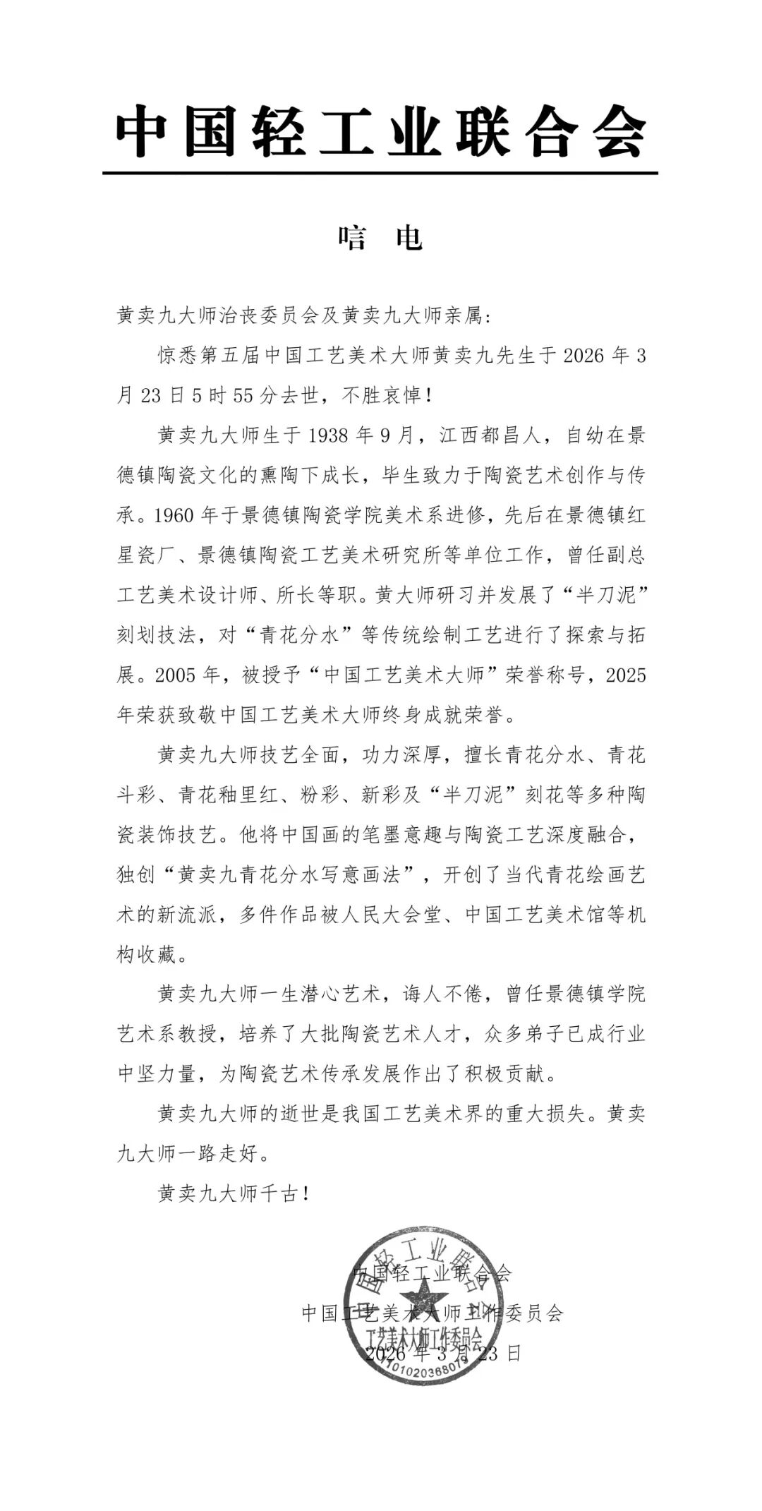 惊悉第五届中国工艺美术大师黄卖九先生于2026年3月23日5时55分去世,不胜哀悼!