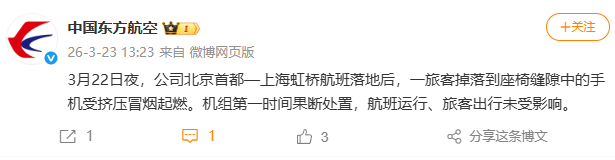 3月23日下午,中国东方航空官方微博就北京飞上海MU5128航班落地虹桥机场后机舱起火一事做出回应:3月22日夜,公司北京首都—上海虹桥航班落地后,一旅客掉落到座椅缝隙中的手机受挤压冒烟起燃。机组第一时间果断处置,航班运行、旅客出行未受影响。
