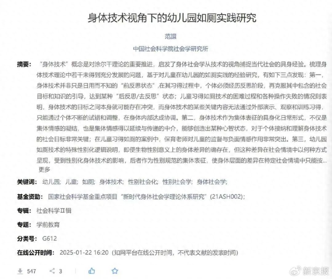 近日,福建师范大学学报(哲学社会科学版)一篇题为《身体技术视角下的幼儿园如厕实践研究》在网络上引起争议。论文中详细描述了男女童如厕时的具体姿势与过程,引发公众对该研究是否尊重儿童隐私、是否履行知情同意程序的质疑。