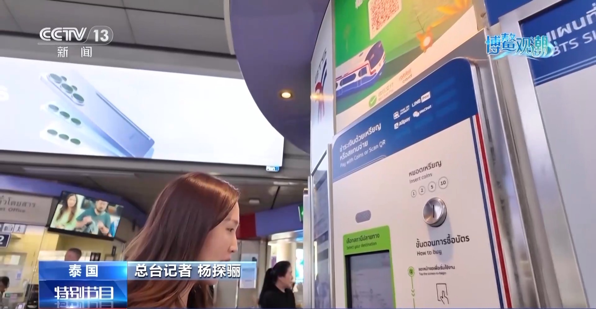 总台记者 杨探骊:我们现在试着在泰国的地铁站买地铁票。这里可以看到,有微信支付和支付宝支付。但我现在要试着用微信支付来扫泰国的移动支付方式。支付成功了,6.77元,自动换算成了人民币。