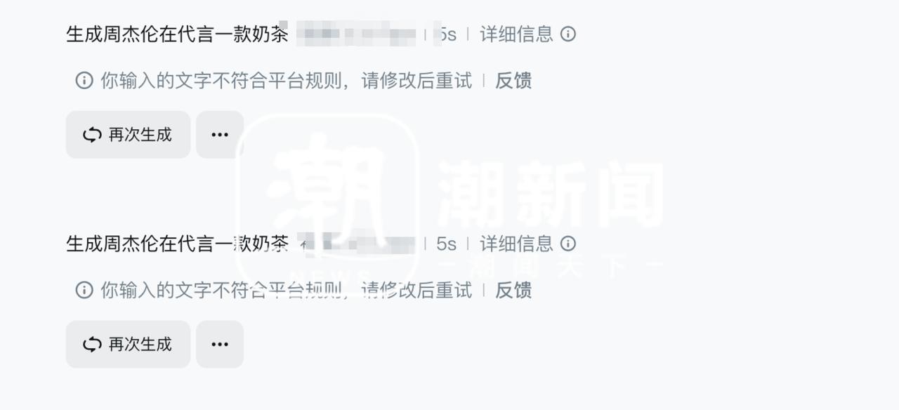 记者以现在主流的视频AI软件为测试对象,尝试生成一段明星代言某饮料的视频。在直接输入包含明星姓名的提示词后,页面提示“不符合平台规则”,生成请求被拦截。然而,当记者改用上传明星图片的方式,平台检测被绕过,最终成功生成了“AI换脸”视频。