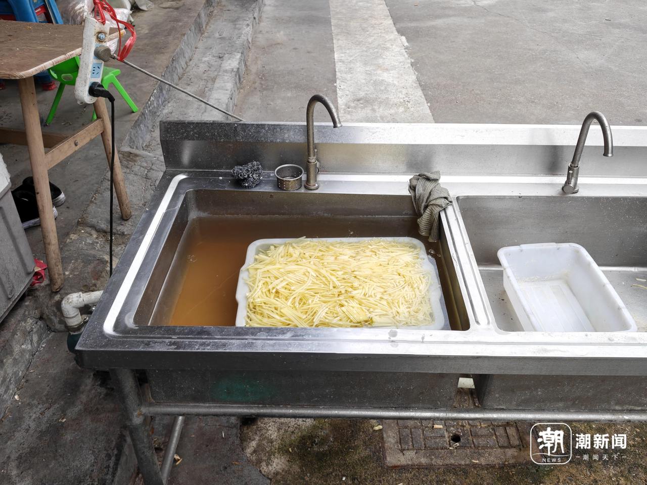 一家外卖店的土豆被浸泡在水池中,而一旁的抹布也有部分浸泡其中,泡土豆的水呈橘黄色。
