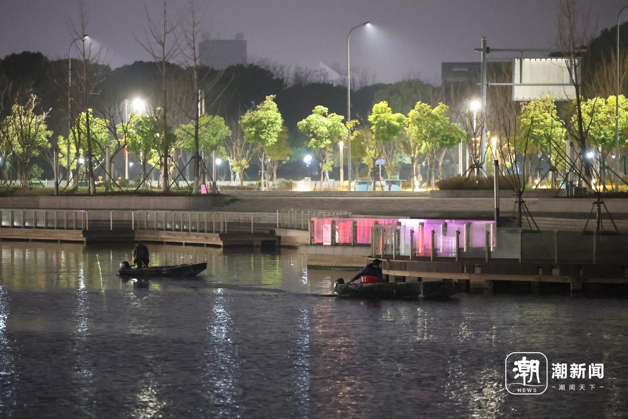 与此同时,在杭州湾南岸的宁波前湾新区,另一番非法捕捞场景也在深夜上演。2月4日零点刚过,新区中心地带的抱云湖(又称“中心湖”)靠近滨海七路的水域,数艘小船一字排开,在湖面上由东向西缓慢推进,进行着“地毯式”捕捞。