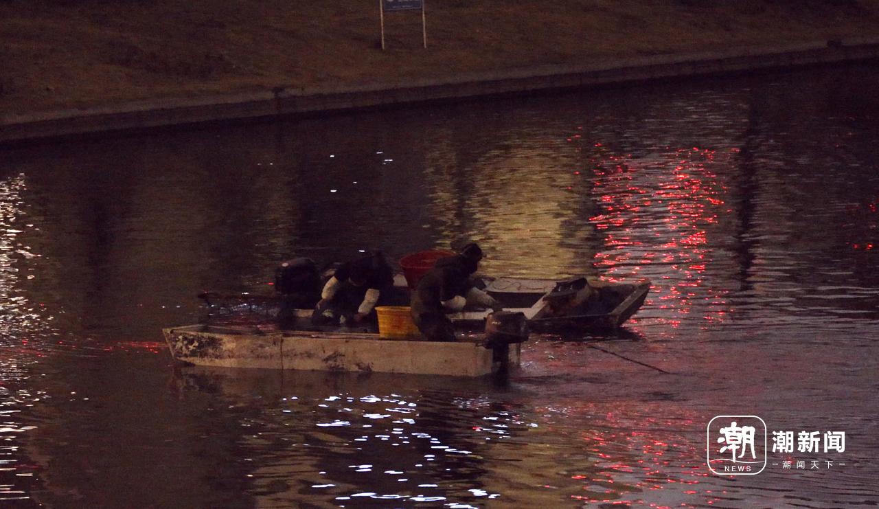 经过近两个小时等待,两辆车上的人开始行动——他们将面包车中的船只、设备一一搬下组装、整理,随后下水开始采用“电拖网”沿着四灶浦南延(新城河)向南实施非法捕捞。直至次日凌晨4时20分左右,两艘船回到停车点,陆续将渔获以及非法捕捞的船只、工具抬上岸,拆卸后装车运走。