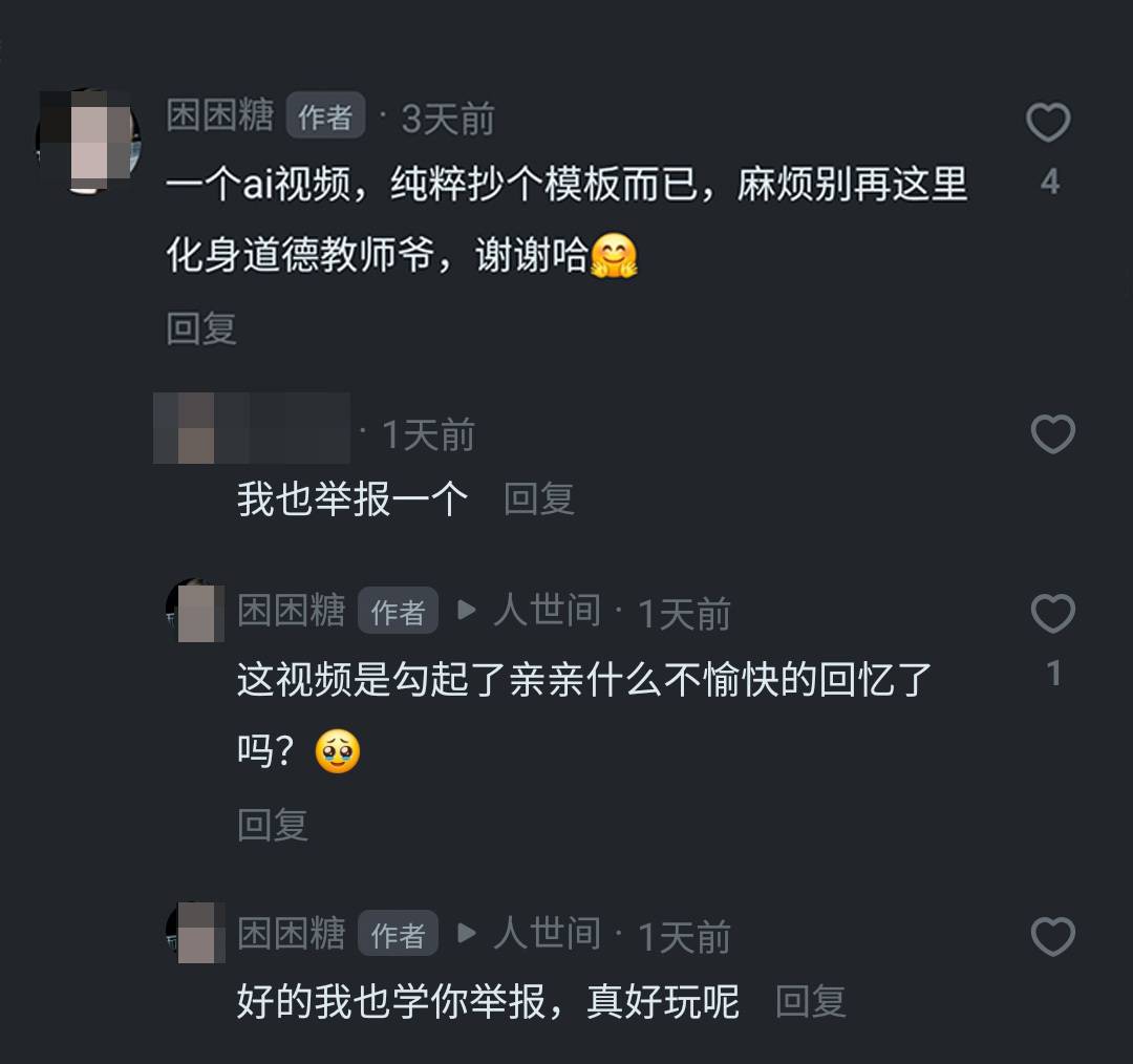 即梦AI用户“困困糖”也发布了一条暴力殴打他人的视频,点赞量较高,有网友留言说“举报了”,“困困糖”却不以为然:“你挺那啥的,玩个AI又跑来做道德教师爷。”