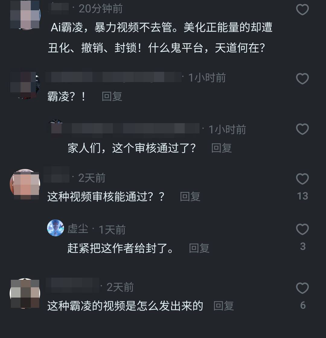 对于这些视频,多名网友表示“看不下去了”,虽然视频是AI生成的,但“太暴力了”,加上画面真实,看后令人不适,并提出质疑:“这叫AI霸凌吗?”“作者是否有受虐倾向?”“什么平台不管这些暴力视频?”