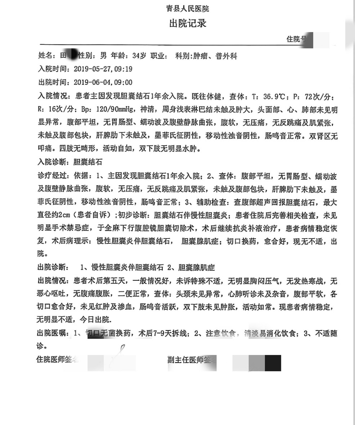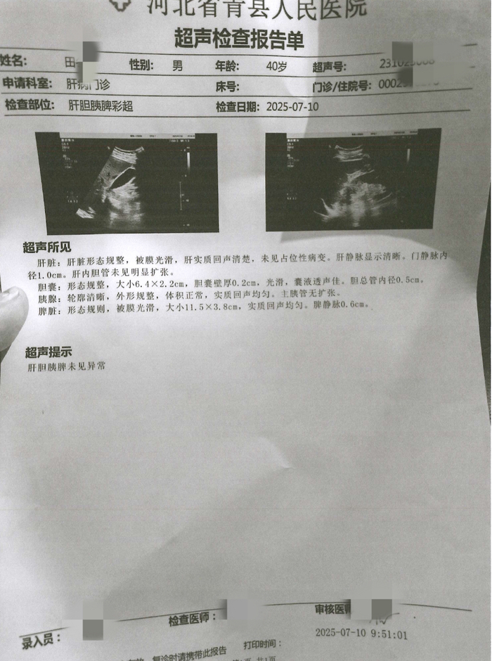 2025年6月,田先生向保险公司投保个人保险时被拒保,保险公司告知其2019年5月27日至6月4日在河北沧州青县人民医院住院,被诊断为慢性胆囊炎伴胆囊结石、胆囊腺肌症,并接受了腹腔镜胆囊切除术。之后,田先生前往医院调取住院病案,确认该手术记录登记在自己名下。为了自证,田先生随后在青县人民医院做肝胆胰脾彩超检查,结果显示胆囊形状规整,肝胆胰脾未见异常。“由此我怀疑,是我的个人信息被他人冒用了。”田先生说。