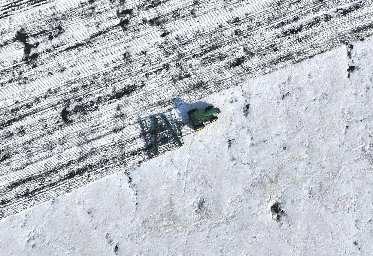 3月24日,北大荒集团北安分公司红星农场有限公司第二管理区有机小麦地块,大马力机车在进行耙雪散墒作业(无人机照片)。新华社发(钱泊羽摄)