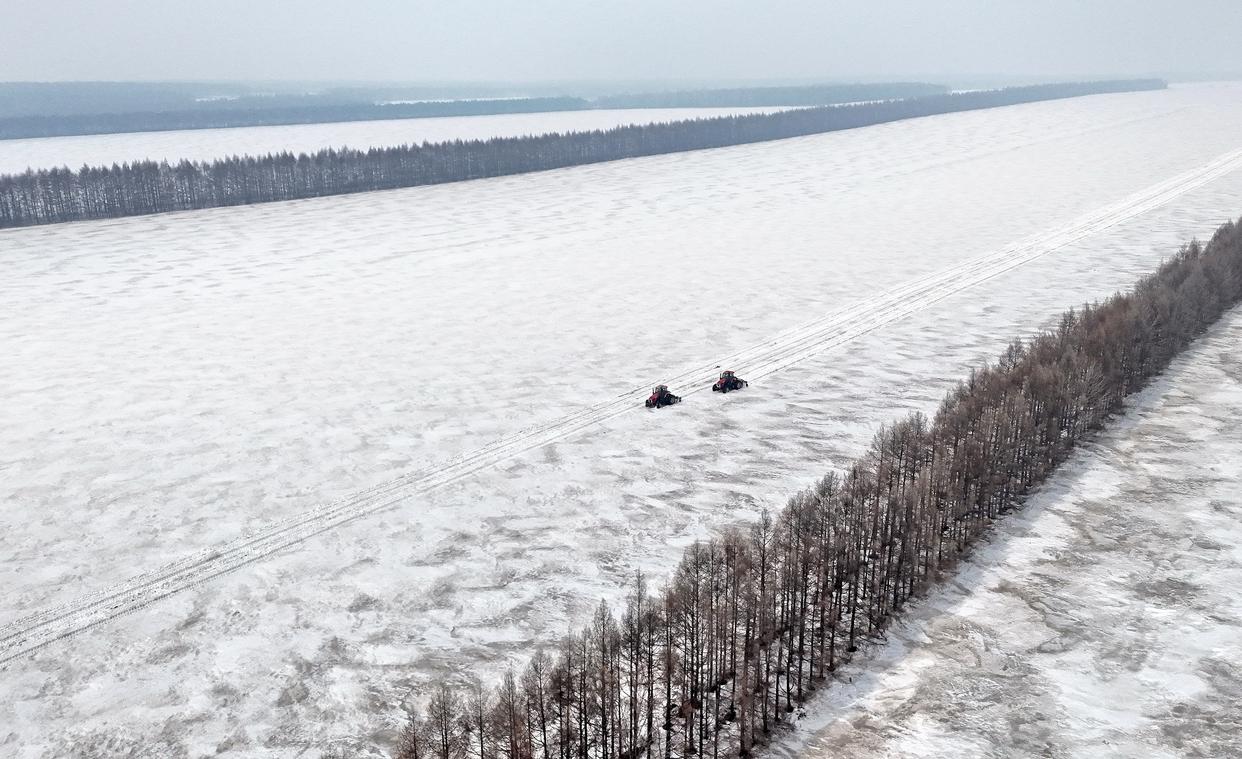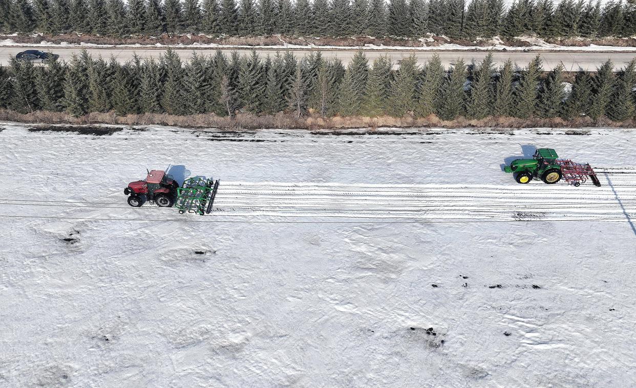 3月24日,北大荒集团黑龙江逊克农场有限公司第五作业区,两台机车在进行耙雪散墒作业(无人机照片)。新华社发(陆文祥摄)