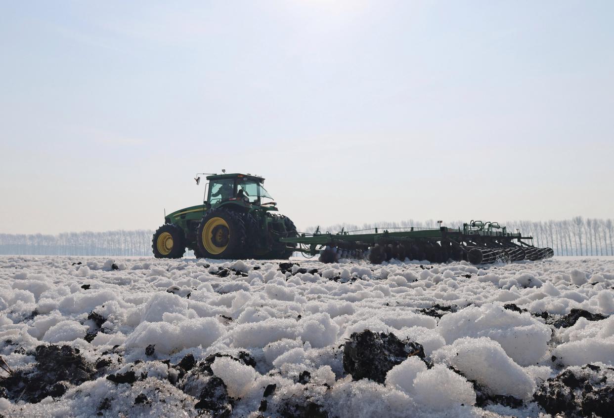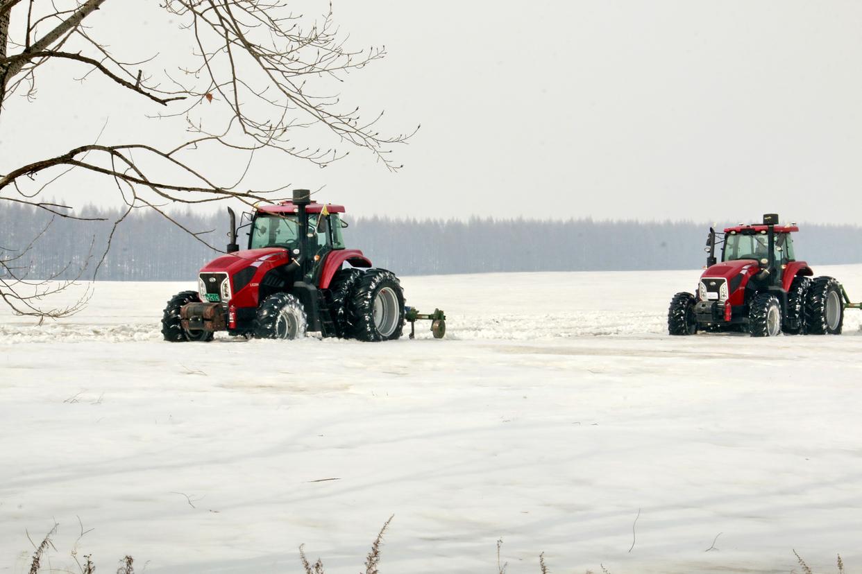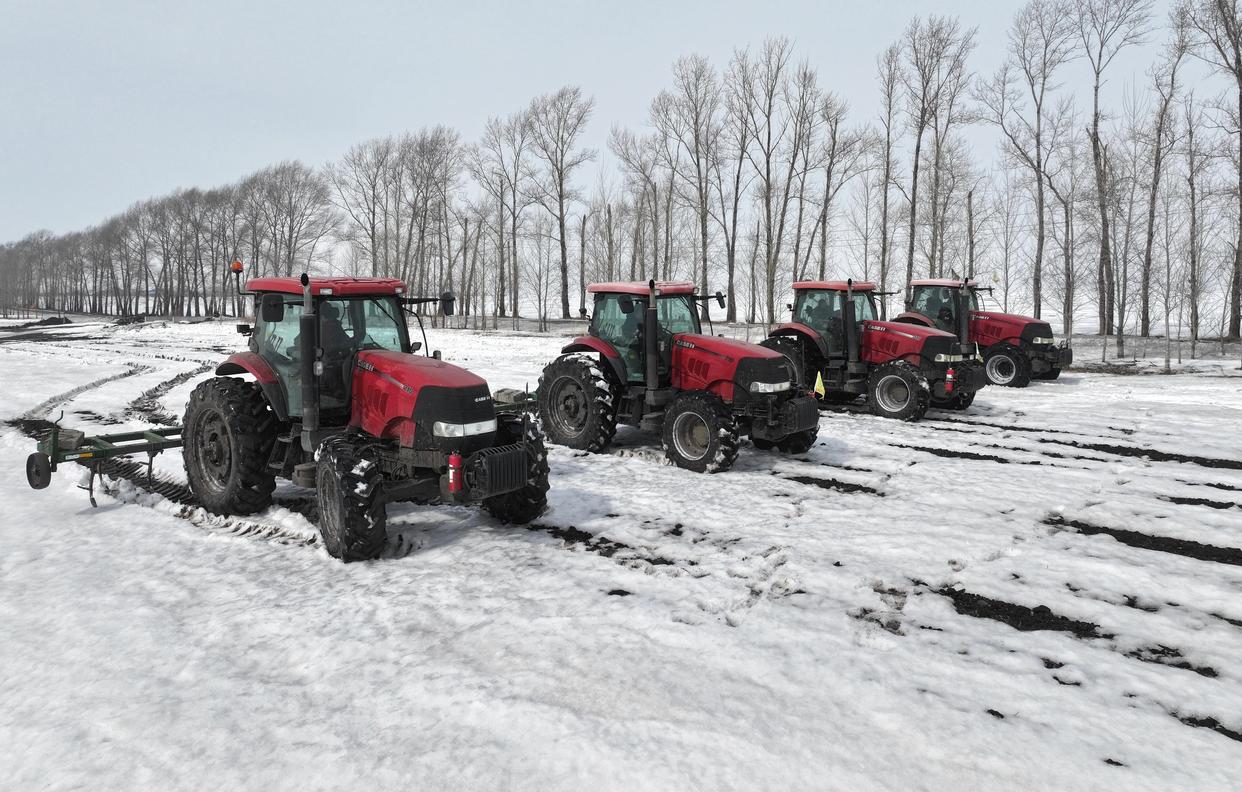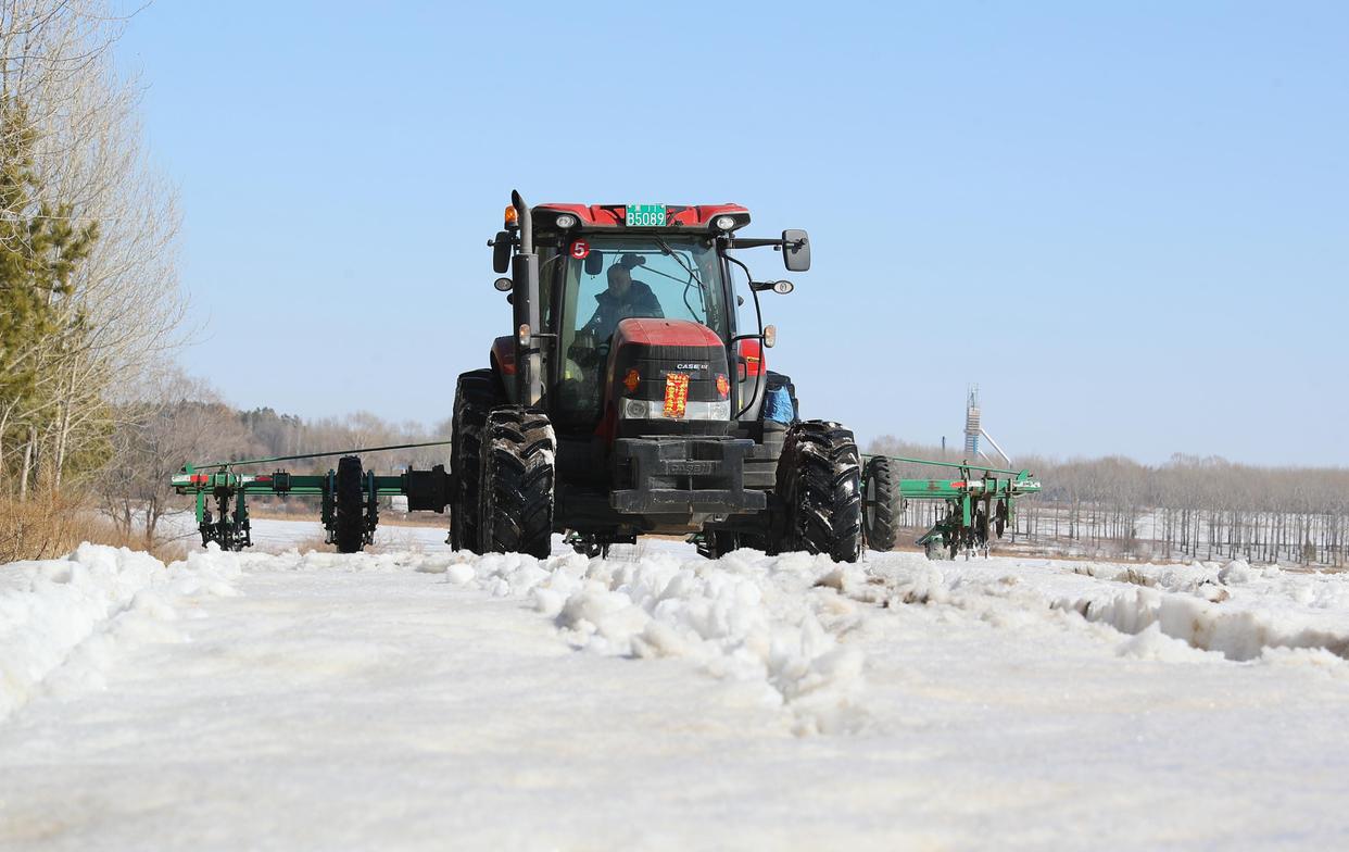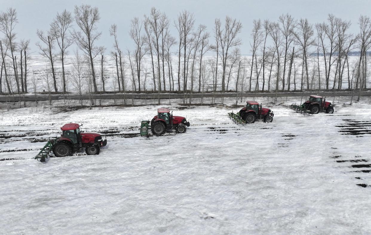 3月23日,北大荒集团北安分公司赵光农场有限公司第一管理区大豆地块,大马力机车在进行耙雪散墒作业。新华社发(钱泊羽摄)