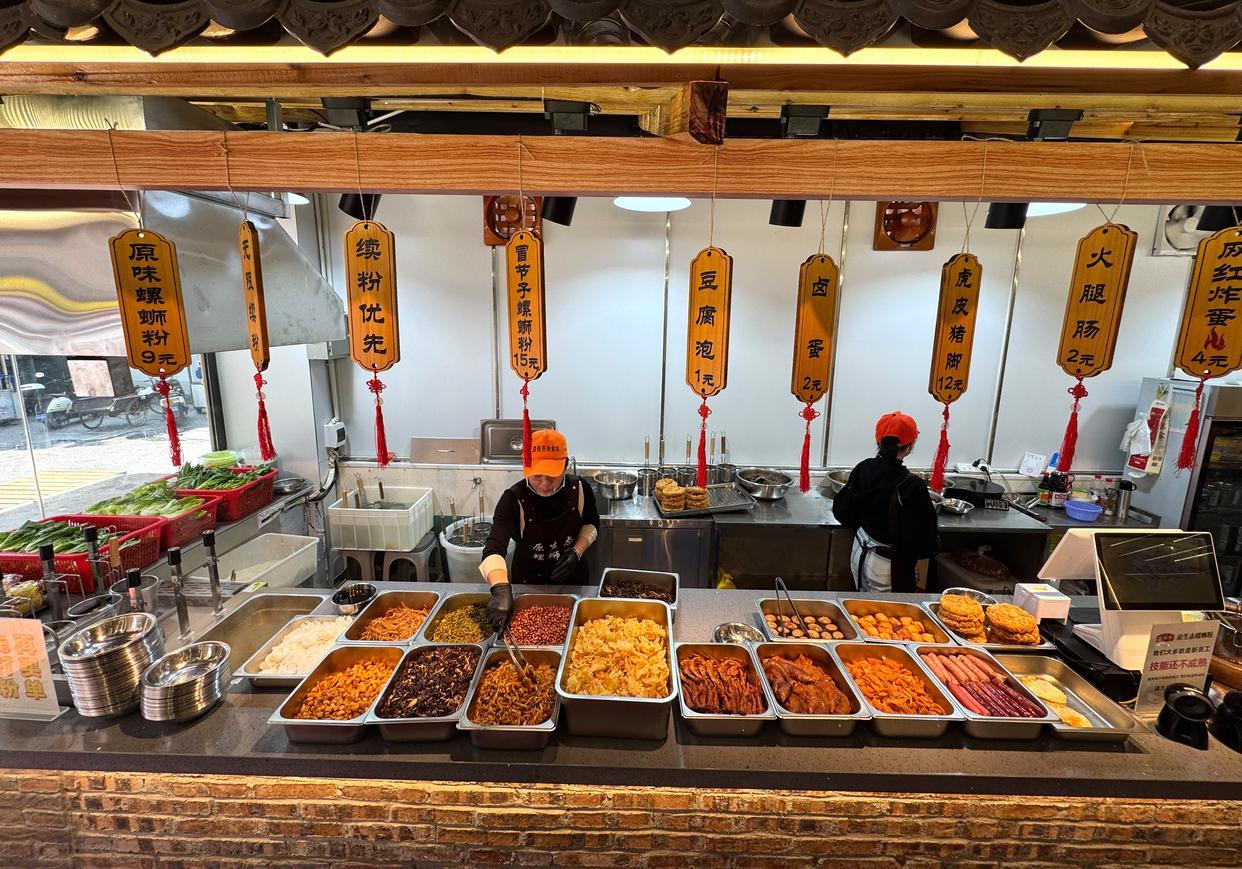 在广西柳州市青云民生市场一家螺蛳粉店,工作人员在准备煮螺蛳粉(2026年3月11日摄)。新华社发(郑昌昊摄)